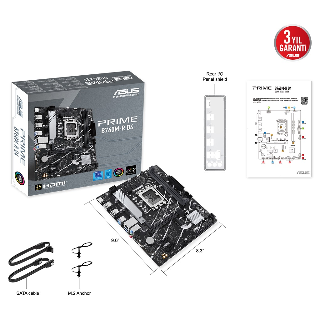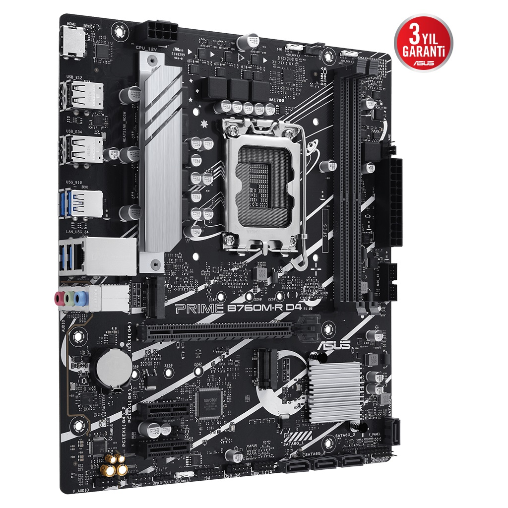 ASUS PRIME B760M-R D4 Intel® B760 LGA 1700 micro-ATX anakart, PCIe 4.0, iki adet PCIe 4.0 M.2 yuvası, DDR4, Realtek 2.5Gb Ethernet, HDMI™, SATA 6 Gbps, ön panel USB 5Gbps bağlantı noktası ve Aura Sync