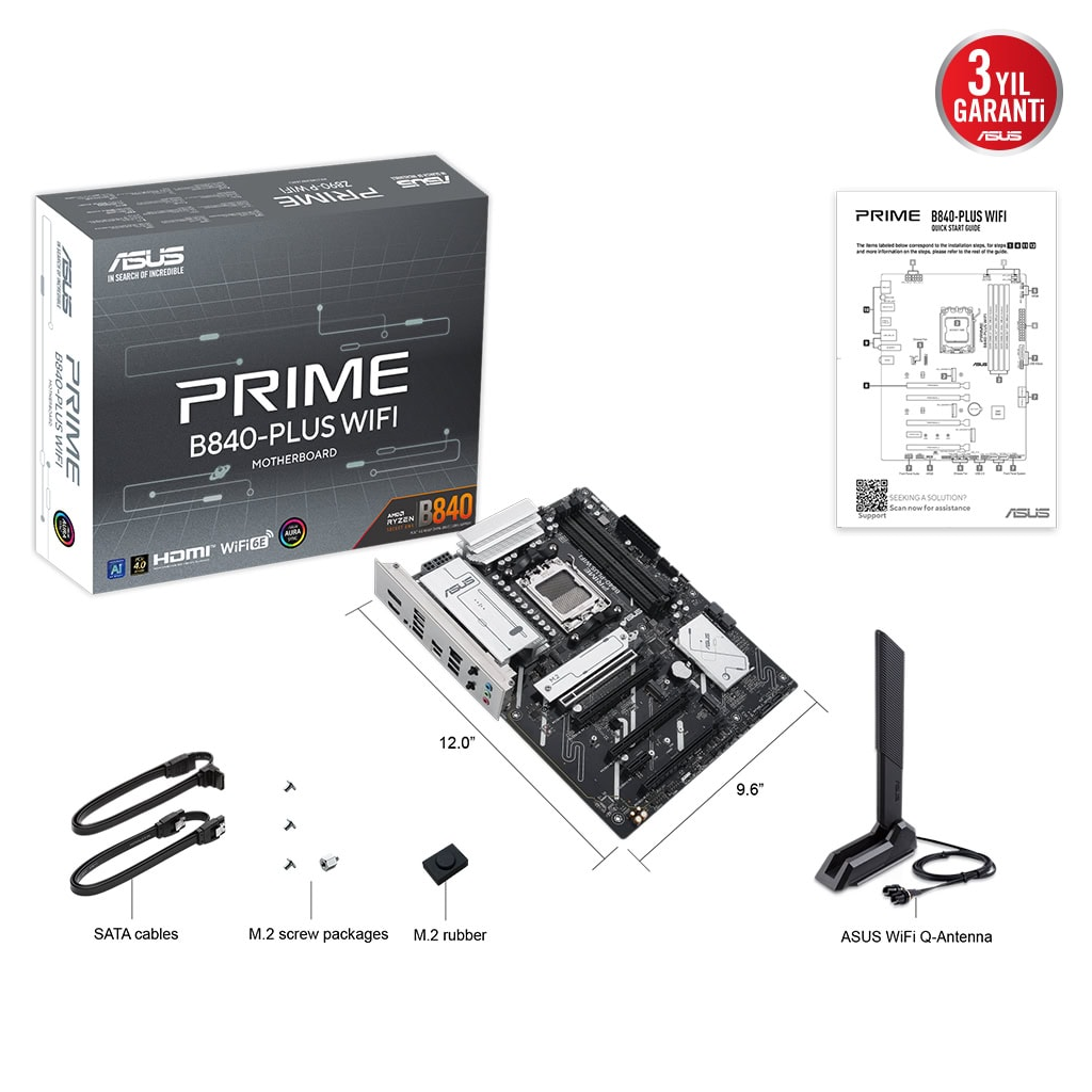 ASUS PRIME B840-PLUS WI-FI, 4xDDR5, 3x M.2, HDMI, DP, Type-C, WI-FI 6E, Bluetooth 5.3, AMD Ryzen 9000 Serisi, AM5 Soket Anakart