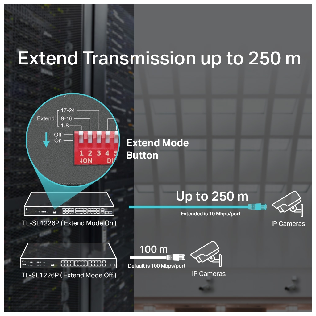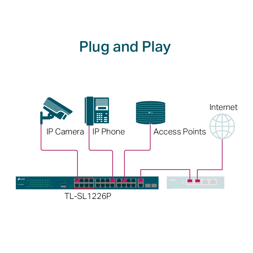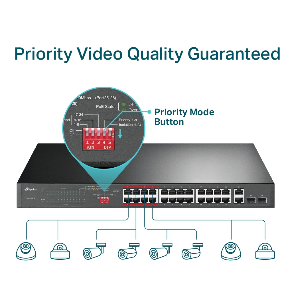 TP-LINK TL-SL1226P, 24 Port, Megabit, PoE 250W, 2 Port Combo Gigabit SFP, Yönetilemez, Rackmount, Switch